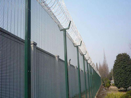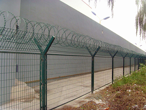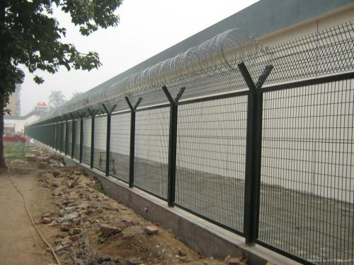监狱护栏网又称作“Y型安全防御护网”,监狱护栏、监狱护栏网、监狱围网,是由V型支架立柱,加强型焊接片网,安全防盗连接件和热镀锌刀片刺笼组成强度和安全防御性级别很高的防护网、护栏网产品。监狱护栏网网片中带有V型加强筋,可大大增强围网的抗冲击力。立柱为60X60的矩形钢,顶端焊有V型之架。或者采用70mmX100mm的挂式连接立柱。广泛应用在监狱,军事基地等高安全场所。监狱护栏网可在顶部加装刀片刺丝、刀片刺绳,这样更加增强了安全防护性能。
